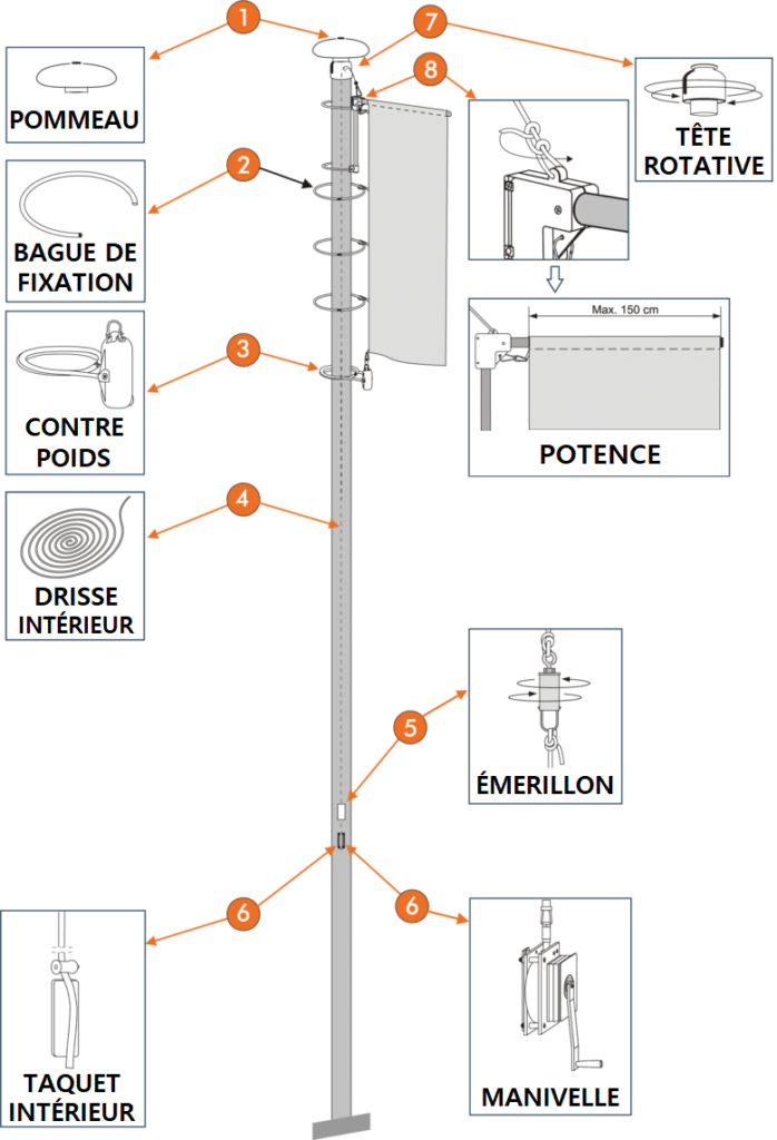 | * “À potence” et “À potence ascensionnelle” – le drapeau est visible et sans vent (grâce au bras rotatif horizontal). ** Le type “à potence” n’est pas équipé avec drisse. Pour changer le drapeau doit abaisser le mât. Les modèles “Standard antivol” et “À potence ascensionnelle” peuvent être équipés en option de treuil pour lever et abaisser le drapeau. |