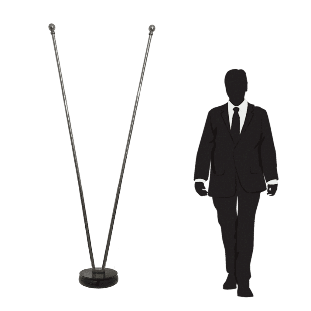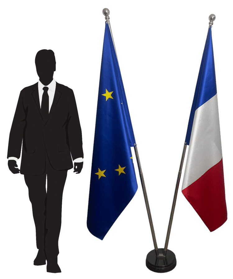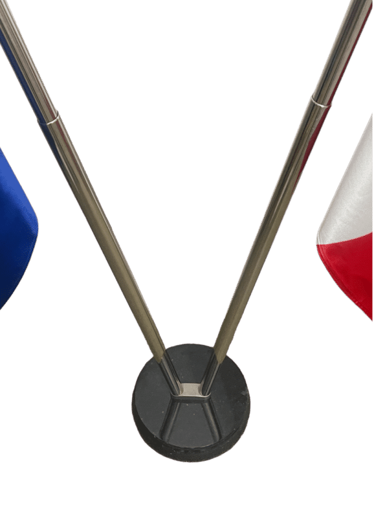 Binnenstandaard ontworpen voor het tonen van twee vlaggen, met een combinatie van een zwart marmeren voetstuk en 2 telescopische roestvrijstalen stokken met een glanzend zilveren afwerking. Het systeem kan tot 2,5 m in hoogte worden versteld en de Ø 310 mm voet, die ongeveer 12 kg weegt, zorgt voor optimale stabiliteit. De stokken met ronde punt bieden een elegante, evenwichtige presentatie, perfect geschikt voor kantoren, instellingen en officiële binnenruimtes.