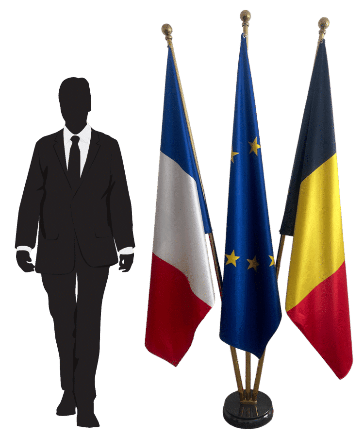 Binnenstandaard ontworpen om drie vlaggen op te hangen, rustend op een stabiele zwart marmeren voet en uitgerust met 3 telescopische roestvrijstalen palen met een glanzende gouden afwerking. De hoogte van het systeem kan worden ingesteld tot 2,5 m, terwijl de Ø 310 mm voet, die ongeveer 12 kg weegt, een uitstekende ondersteuning biedt. De palen met ronde uiteinden geven het geheel een elegante en evenwichtige uitstraling, ideaal voor kantoren, instellingen en officiële binnenruimtes.