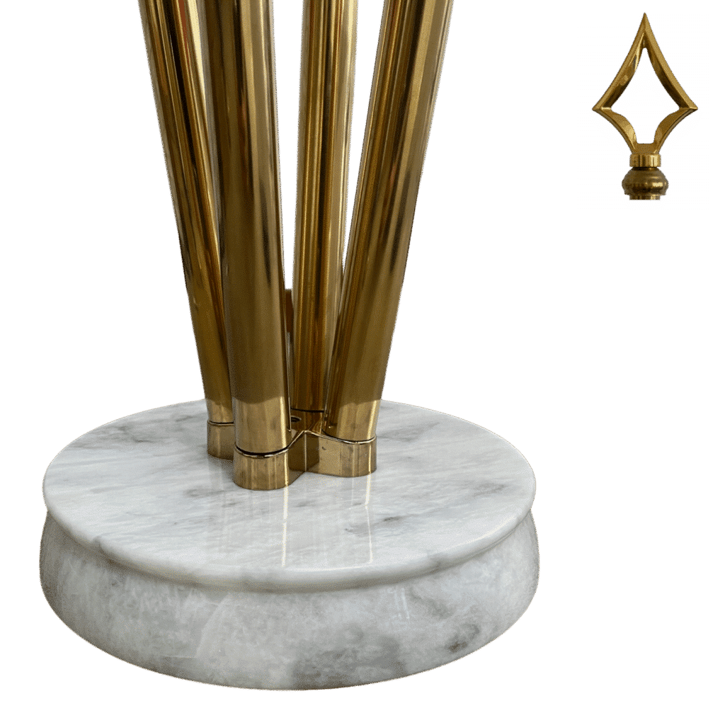 Wit marmeren voetstukken en roestvrijstalen masten, goudkleurig afgewerkt