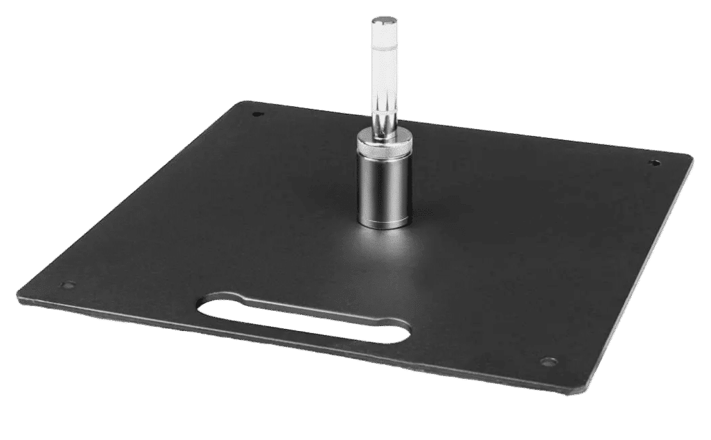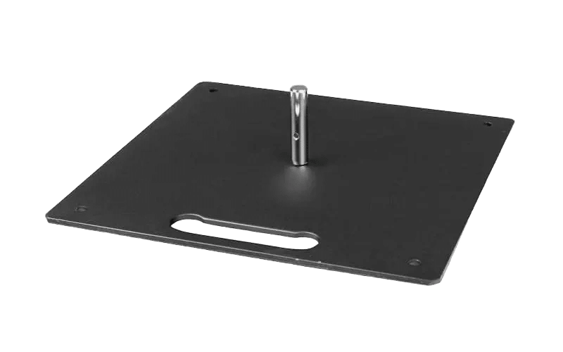 Vierkante basis van zwart staal, 12 kg. De voetplaat kan binnen en buiten worden gebruikt. Gat in elke hoek voor verankering met sardines (niet gesmeed) of rubberen voetjes.